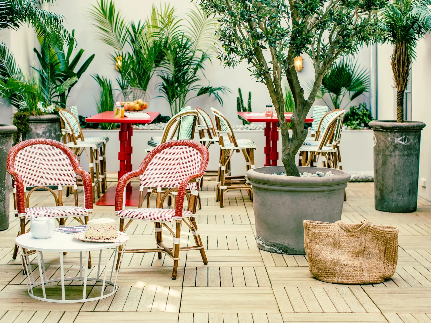 Le deuxième espace, le patio est une invitation au voyage, une ôde à la nature et à la déconnexion. L’ambiance coloniale est de mise, le sol en bois clair et de jolis miroirs arrondis au mur répondent à une banquette linéaire et graphique aux couleurs acidulées signées Hermés. Ici, on se rencontre grâce à une idée originale : le lanceur de discussions. Telle une roulette de casino, ce jeu permettra aux clients les plus joueurs de mieux se connaître grâce aux questions disposées sur le dessus.